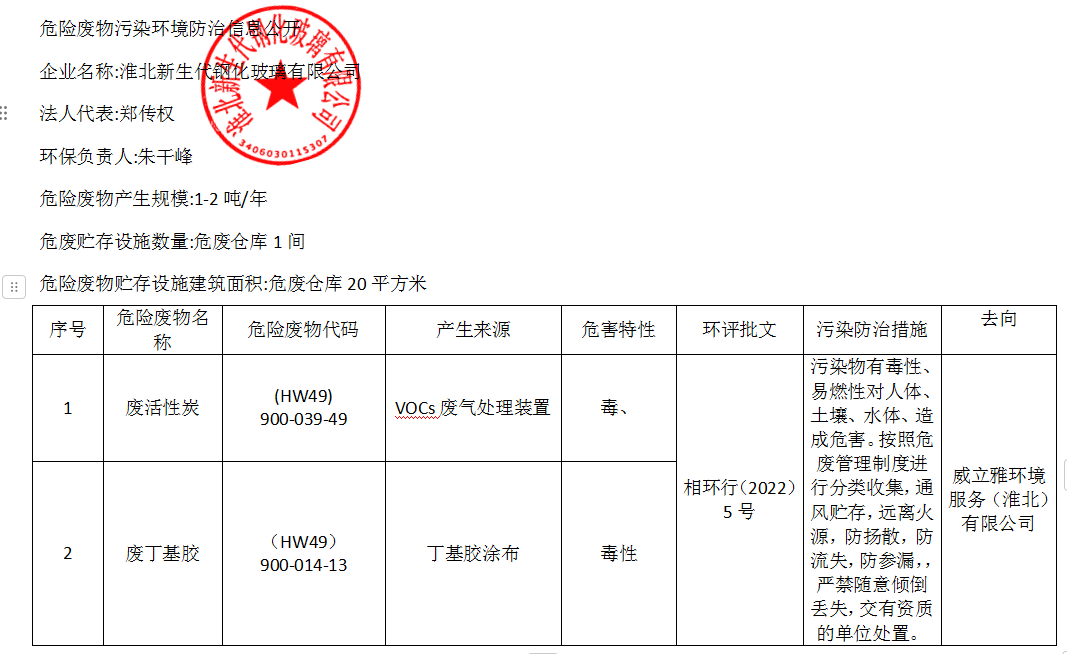 危险废物污染环境防治信息公开企业名称:淮北新生代钢化玻璃有限公司法人代表:郑传权环保负责人:朱干峰危险废物产生规模:1-2吨/年危…